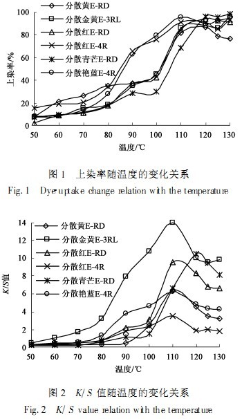 采用2種類型6只染料,分別為分散紅ERD,分散黃ERD,分散青芒ERD,分散金黃E3RL,分散艷藍E4R和分散紅E4R在質(zhì)量分數(shù)為2%(o.w.f)、硫酸銨質(zhì)量濃度為1g/L、用冰醋酸調(diào)節(jié)pH值到5、浴比50:1的條件下,在不同溫度將麂皮絨恒溫染色1h(100℃和100℃以上,由于存在升溫過程,所以100℃保溫45min,110℃時保溫42min,120℃時保溫38min,125℃時保溫36min,130℃時保溫34min),然后分別測定它們的上染率和K/S值,測試結(jié)果見圖1、2。