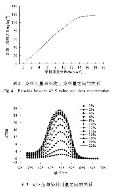 在硫酸銨為1g/L、用冰醋酸調(diào)節(jié)pH值到5、浴比50:1的條件下,采用不同質(zhì)量分數(shù)的分散紅ERD對麂皮絨進行染色,以3℃/min的速率從室溫升至50℃,然后以1℃/min的速率升至90℃,保溫20min,再以1℃/min的速率升溫至120℃保溫50min,然后以1℃/min的速率下降到70℃;最后在80℃min用2g/L的Na2CO3和2g/L的凈洗劑清洗20min。之后測定織物的K/S值和染料含量,結(jié)果分別見圖4和圖5。