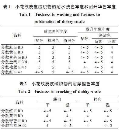 按照2.3確定的染色工藝對小花紋麂皮絨織物進行染色處理及2.4確定的還原清洗工藝進行清洗后,測得織物的染色牢度見表1、2。從表中數(shù)據(jù)可見,根據(jù)2.3染色工藝和2.4還原清洗工藝處理的小花紋麂皮絨織物在水洗牢度、升華牢度和摩擦色牢度方面都能夠獲得較好的效果。