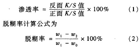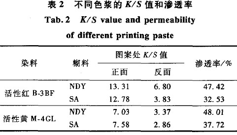NDY糊料是一種以多糖類化合物為主要原料的復(fù)合改性糊料,分別對(duì)木漿進(jìn)行堿化和微細(xì)化處理后,經(jīng)醚化、羧化制成組分A,土豆淀粉經(jīng)交聯(lián)、接枝、醚化后再引入磺乙基團(tuán)得組分B,以聚乙烯吡咯烷酮(PVP)等化學(xué)品為組分c,利用多元復(fù)合化學(xué)工藝技術(shù)復(fù)配而成,價(jià)格方面較之海藻酸鈉有很大的優(yōu)勢(shì)。本文對(duì)NDY糊料與海藻酸鈉在原糊性能和印花效果方面進(jìn)行分析和比較,以期找到能夠彌補(bǔ)海藻酸鈉的缺陷,進(jìn)而替代海藻酸鈉作為活性染料印花的糊料。 1 實(shí)驗(yàn)部分 1.1 材料與儀器 織物:純棉漂白平紋布,經(jīng)緯紗線密度為14.7 tex × 14.7 tex,經(jīng)緯密為287 根/10 cm×287根/10 cm。 藥品:印花糊料NDY,湖北達(dá)雅化工有限公司提供;丁醇(分析純)、吡啶(分析純)、海藻酸鈉 (SA)、碳酸氫鈉、防染鹽S、尿素;活性紅B.3BF,活性黃M-4GL,均為工業(yè)品,市購(gòu)。 儀器:NDJ-8S型旋轉(zhuǎn)黏度計(jì),上海精密科學(xué)儀器有限公司;SF-600電腦測(cè)色配色儀,美國(guó)Datacolor 公司;JJ-1型精密增力電動(dòng)攪拌器,常州國(guó)華電器有限公司;B220型恒溫水浴鍋,上海亞榮生化儀器廠; 101AS型電熱鼓風(fēng)干燥箱,上海索譜儀器有限公司; Y571B型摩擦牢度測(cè)試儀,溫州大榮紡織標(biāo)準(zhǔn)儀器廠。 1.2 原糊和色漿的制備 原糊制備:將NDY印花糊料和海藻酸鈉(SA) 分別與去離子水混合,用電動(dòng)攪拌機(jī)攪拌約30 min,使其呈均勻透明狀,靜置過(guò)夜使糊料充分膨化。 色漿制備:具體方法見文獻(xiàn)[3]。色漿處方為:活性染料2%,尿素10%,防染鹽S 1%,碳酸氫鈉 2%,原糊50%,加去離子水至100%。 1.3 印花工藝 調(diào)漿一印花(手工)一烘干(60℃ )一汽蒸 (100~102℃ ,8 min)一冷水洗一熱水洗一皂煮(肥皂5 g/L,沸煮10 min)一熱水洗一冷水洗一烘干 (60℃ )。 1.4 測(cè) 試 1.4.1 基本性能測(cè)試 成糊率:分別配制不同濃度的原糊,采用NDJ. 8S型旋轉(zhuǎn)黏度計(jì)在15℃ 下測(cè)其黏度(轉(zhuǎn)速為 6 r/min,4號(hào)轉(zhuǎn)子),并繪制出糊料的成糊率曲線。黏度和印花黏度指數(shù)(PVI值)測(cè)試:分別在15℃ 下測(cè)定3% 的原糊在不同轉(zhuǎn)速下的黏度。 PVI值=η6/ηo.6,其中η6和η0.6分別是轉(zhuǎn)速為6 r/min和0.6 r/min時(shí)的原糊黏度。 化學(xué)品對(duì)原糊黏度的影響:在50 g原糊中加入 25 mL去離子水,調(diào)勻后用數(shù)顯旋轉(zhuǎn)黏度計(jì)測(cè)其黏度,作為參比的原始黏度。各另取50 g原糊,分別加入已配制好的一定濃度的化學(xué)助劑溶液,調(diào)勻并測(cè)其黏度(轉(zhuǎn)速為30 r/min,4號(hào)轉(zhuǎn)子),繪制出原糊黏度隨化學(xué)助劑濃度的增大而變化的曲線。 抱水性測(cè)試:稱取原糊25 g,加入25 mL去離子水,攪拌均勻后將尺寸為10 cm×2 cm的劃有插入線標(biāo)記的定量濾紙插入糊1 cm處,使糊面與刻度線一致。記錄30 min后水上升的高度。 與活性染料的反應(yīng)性:測(cè)試方法見文獻(xiàn)[5]中的印花實(shí)驗(yàn)方法,分別對(duì)此糊料與活性紅B一3BF、活性黃M-4GL 2種活性染料的反應(yīng)性進(jìn)行測(cè)試。 1.4.2 印花性能測(cè)試 K/S值:分別用活性紅B.3BF、活性黃M.4GL與 2種糊料配制色漿,印花洗凈、烘干后用電子測(cè)色配色儀在D65光源、10。視場(chǎng)下測(cè)定印花織物正面的 K/S值。K/S值越大,得色越深。 滲透率:由印花織物反面與正面的K/S值之比表示,如式(1)所示。其值越高,滲透性越好。 式中:W 1為印花并烘干后織物的質(zhì)量;W2為洗凈后印花織物的質(zhì)量;W0為未印花織物的質(zhì)量。 印花織物色牢度:耐洗色牢度按GB/T 3921.3—1997《紡織品色牢度試驗(yàn)?zāi)拖瓷味龋涸囼?yàn)3》制樣;耐摩擦牢度按GB/T 3920-1997《紡織品色牢度試驗(yàn)?zāi)湍Σ晾味取分茦,采用SF-600電腦測(cè)色配色儀進(jìn)行褪色牢度儀器評(píng)級(jí)。 2 結(jié)果與討論 2.1 原糊性能 2.1.1 原糊的成糊率曲線 圖1示出NDY和SA的成糊率曲線。可以看出,2種糊料的黏度都隨質(zhì)量分?jǐn)?shù)的增加而增大。在同樣的質(zhì)量分?jǐn)?shù)下,NDY復(fù)合印花糊料的黏度幾乎是海藻酸鈉的3—1O倍,說(shuō)明NDY復(fù)合印花糊料的成糊率高于海藻酸鈉。NDY糊料中的組分A是由高黏度、高取代度的天然改性高分子組成,部分組分經(jīng)過(guò)化學(xué)交聯(lián),由于分子間引力更易形成三維網(wǎng)狀結(jié)構(gòu);PVP同時(shí)是良好的增稠劑,在加入后由于其與一COO一基團(tuán)的親和力,造成高分子之間的相互纏結(jié),產(chǎn)生較高的黏度。SA糊料中的-COO-之間的相互排斥,使得大分子鏈之間不易形成網(wǎng)狀結(jié)構(gòu),因此其成糊率比NDY要低。 2.1.2 流變性(PVI值) 印花原糊流變性的好壞對(duì)印花效果有很大的影響。PVI值是反映原糊流變性的重要指標(biāo)之一。 表1示出不同轉(zhuǎn)速下的黏度值及PVI值。 由表1可知,在相同的轉(zhuǎn)速下,NDY原糊的黏度比SA大很多。由PVI值可知,2種原糊均屬假塑性流體。NDY的PVI值比海藻酸鈉的要小,結(jié)構(gòu)黏度大,假塑性更明顯;NDY屬于部分組分化學(xué)交聯(lián)的混合物,而SA屬于非化學(xué)交聯(lián)型結(jié)構(gòu),同時(shí)由于分子上的陰離子基團(tuán)間的斥力,結(jié)構(gòu)黏度低。流變性能比NDY更接近牛頓流體。從理論止說(shuō);在相同的印花條件下,NDY比SA更適合