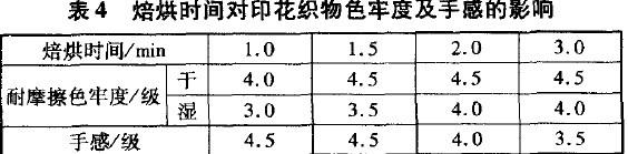 表4為在恒星硅乳用量1.5% ,焙烘溫度130度條件下,不同焙烘時間對印花織物牢度性能和手感的影響。
