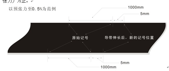 使用精密的鋼卷尺在導(dǎo)帶的兩側(cè)邊緣丈量延伸后的記號長度。例如:假設(shè)需求的預(yù)張力為 0.5%,則必須將1000mm的記號延伸成為1005mm為止,之后以極慢速讓導(dǎo)帶運轉(zhuǎn)一段時間(大約5~10分鐘),并調(diào)整兩個主動輪的中心或?qū)д喌慕嵌龋榔н\轉(zhuǎn)時不跑偏為止。再停機丈量兩側(cè)邊緣的記號長度;導(dǎo)帶在經(jīng)過一段時間的運轉(zhuǎn)后,記號的長度可能會縮短,視具體情況再將導(dǎo)帶延伸至所需求的延伸比率為止,并再度以極慢速讓導(dǎo)帶運轉(zhuǎn)。
