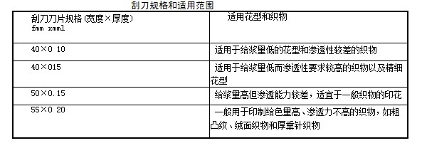 目前常用的不銹鋼刮刀規(guī)格和適用范圍。刮刀規(guī)格的選用應(yīng)視織物的厚薄稀密、印花圖案、色漿流變性以及給漿量要求等而定。其規(guī)律是刀片越厚,彈性越差,承壓大,借機(jī)械力使色漿滲入織物的能力也大,反之,則色漿滲入織物的能力就差。