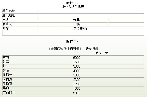 隨著紡織印染行業(yè)的發(fā)展,近幾年來,為了適應市場應變能力,實現(xiàn)行業(yè)的可持續(xù)發(fā)展,大量的企業(yè)經(jīng)過多次改制重組,組織結構、體制都發(fā)生了很大的變化,也新興了一批印染印花企業(yè),為了更好的了解、掌握行業(yè)信息,加強企業(yè)之間相關溝通交流,中國印染行業(yè)協(xié)會印花技術專業(yè)委員會、華夏印染網(wǎng)定于2010年印刷出版《全國印染行業(yè)通訊錄》,免費入編印染行業(yè)各企業(yè)通訊信息(包括單位、地址、聯(lián)系電話、網(wǎng)址、郵編等)。 歡迎各有關單位及時傳遞正確通訊信息,以便及時入編。