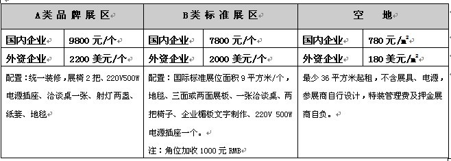 注:角位加收1000元RMB 最少36平方米起租,不含展具、電源,參展商自行設(shè)計(jì),特裝管理費(fèi)及押金展商自負(fù)。