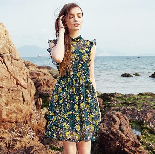 薄紗輕掩,掩去的不是纖細(xì)流線,而是若隱若現(xiàn)格外搶眼,印花細(xì)碎甚至色調(diào)稍顯深沉,但內(nèi)涵演繹的就是這有如夜幕降臨時(shí)分的神秘氣息,花葉隨風(fēng)起,窈窕搖曳,飄逸越發(fā)瑰麗。