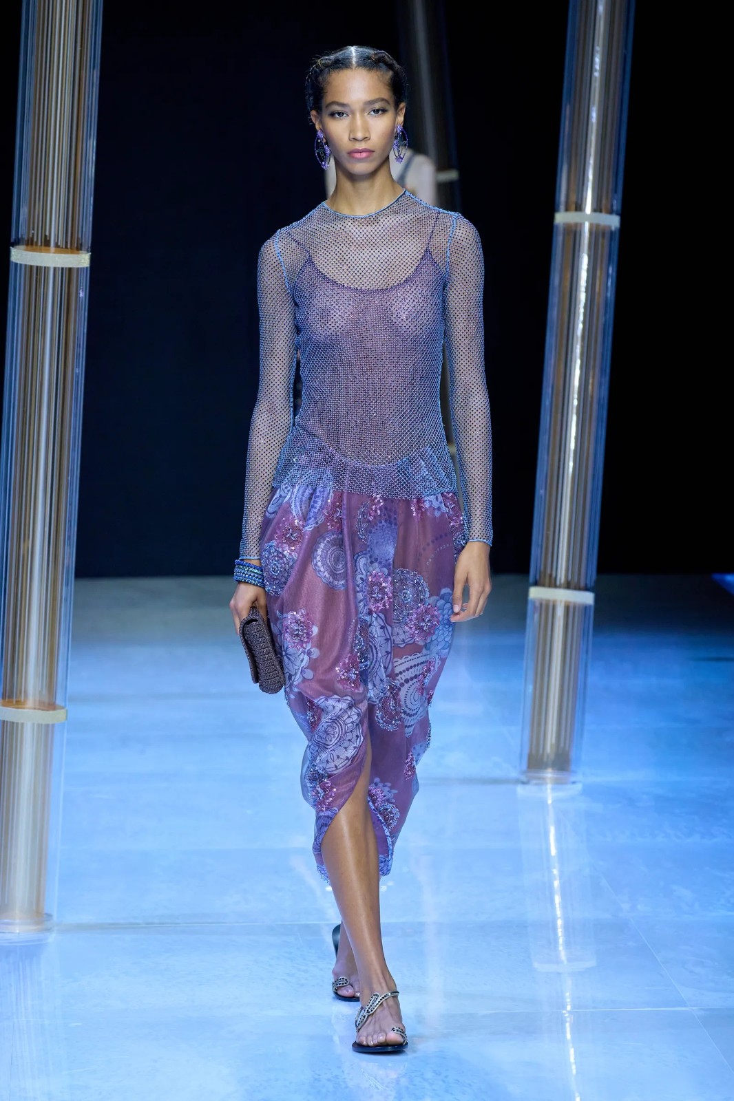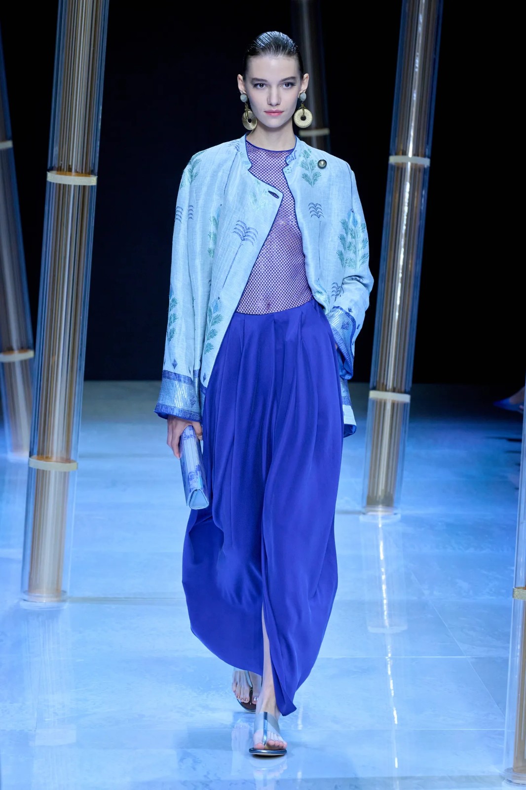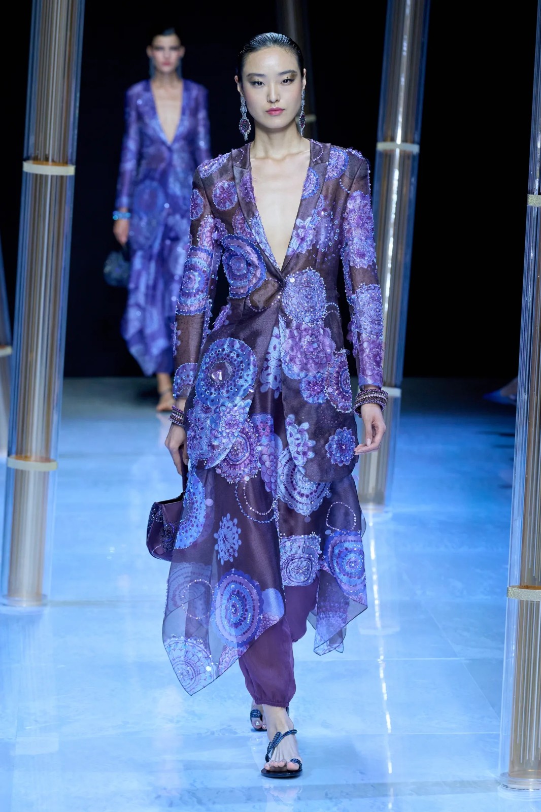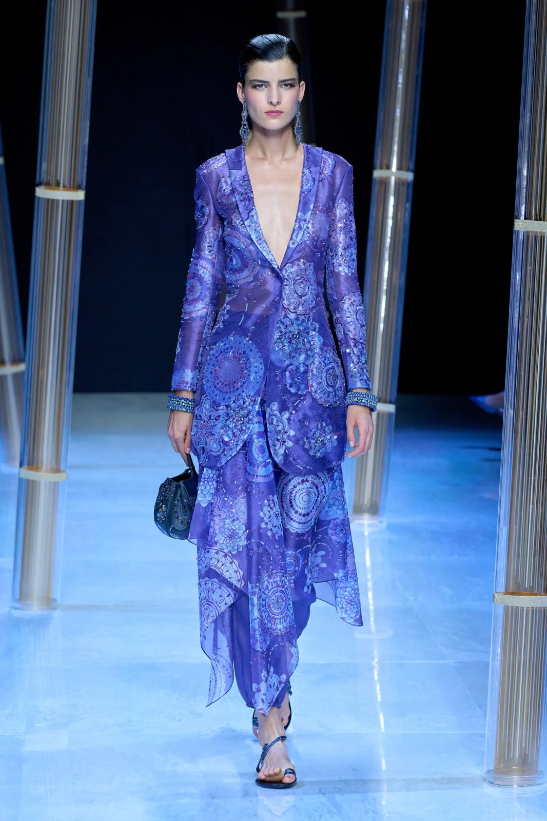 Giorgio Armani用女裝系列帶來了一次跨文化之旅。珠飾連衣裙、亮片上衣、緞面連衣裙、真絲襯衫等單品,均給人以閃閃發(fā)光的視覺體驗(yàn),惹眼卻不過分高調(diào)。阿瑪尼先生最擅長的深藍(lán)色也沒有缺席,他融合了跨文化設(shè)計(jì),從庫爾塔和旗袍等各種服裝中汲取靈感,配合大量的配飾,強(qiáng)調(diào)了輕盈和漂亮的風(fēng)格,宛如女神與精靈的化身,神秘且空靈。