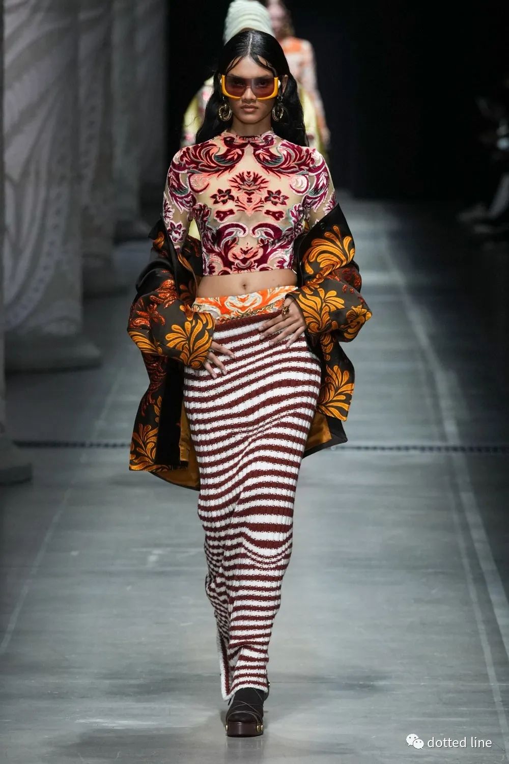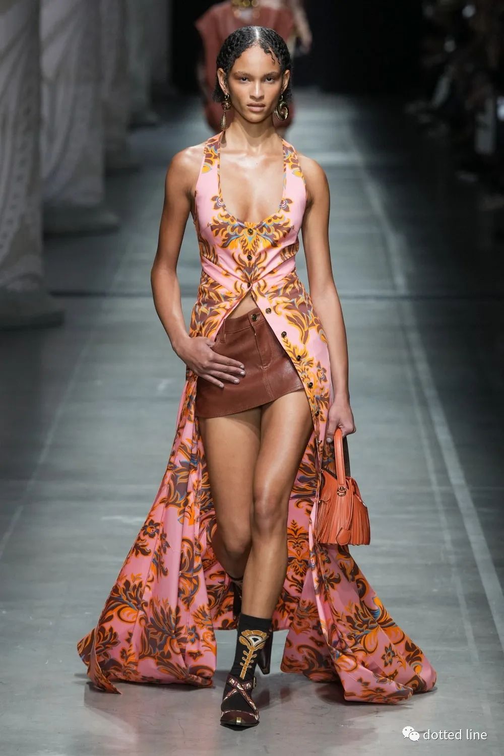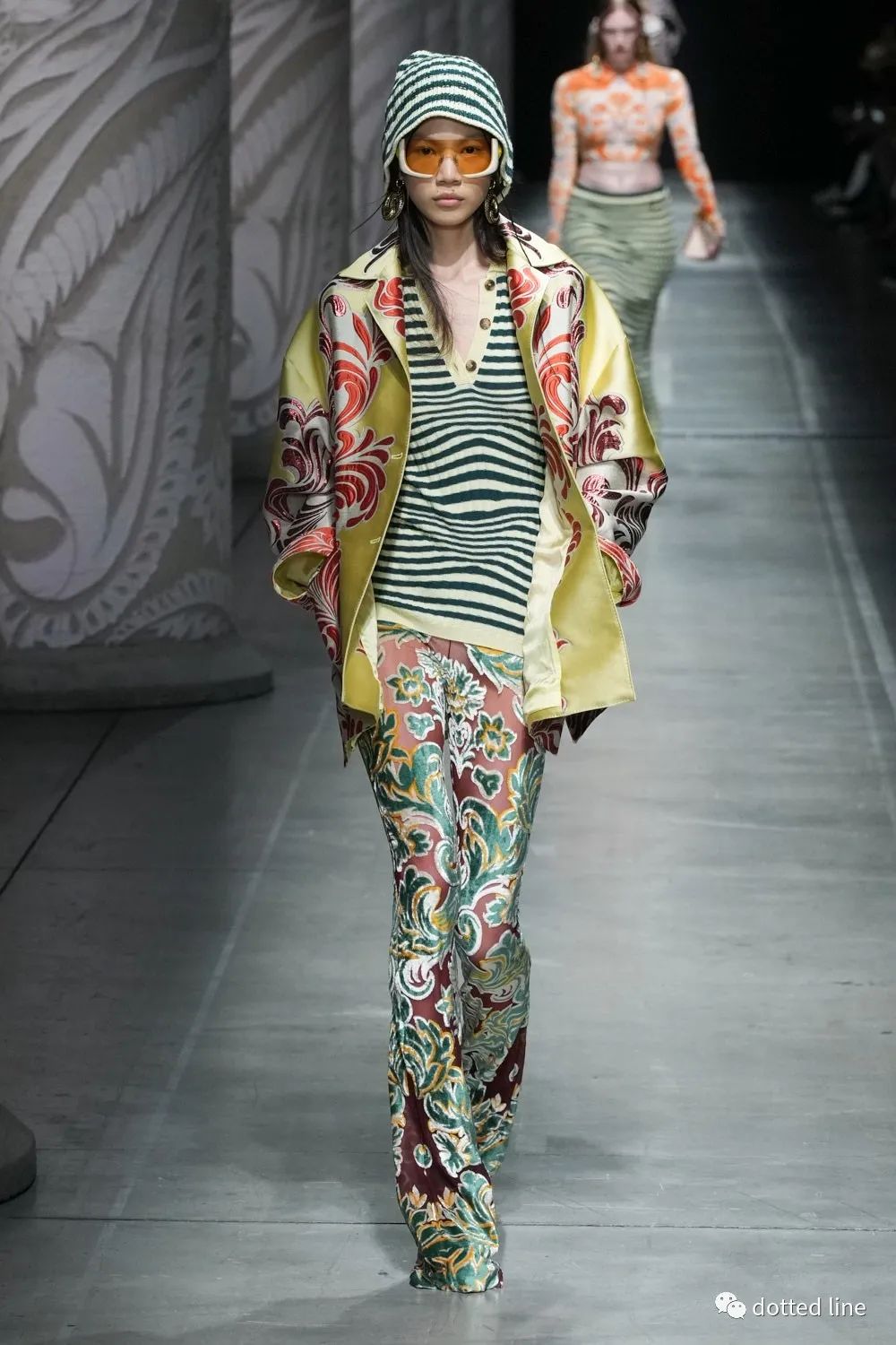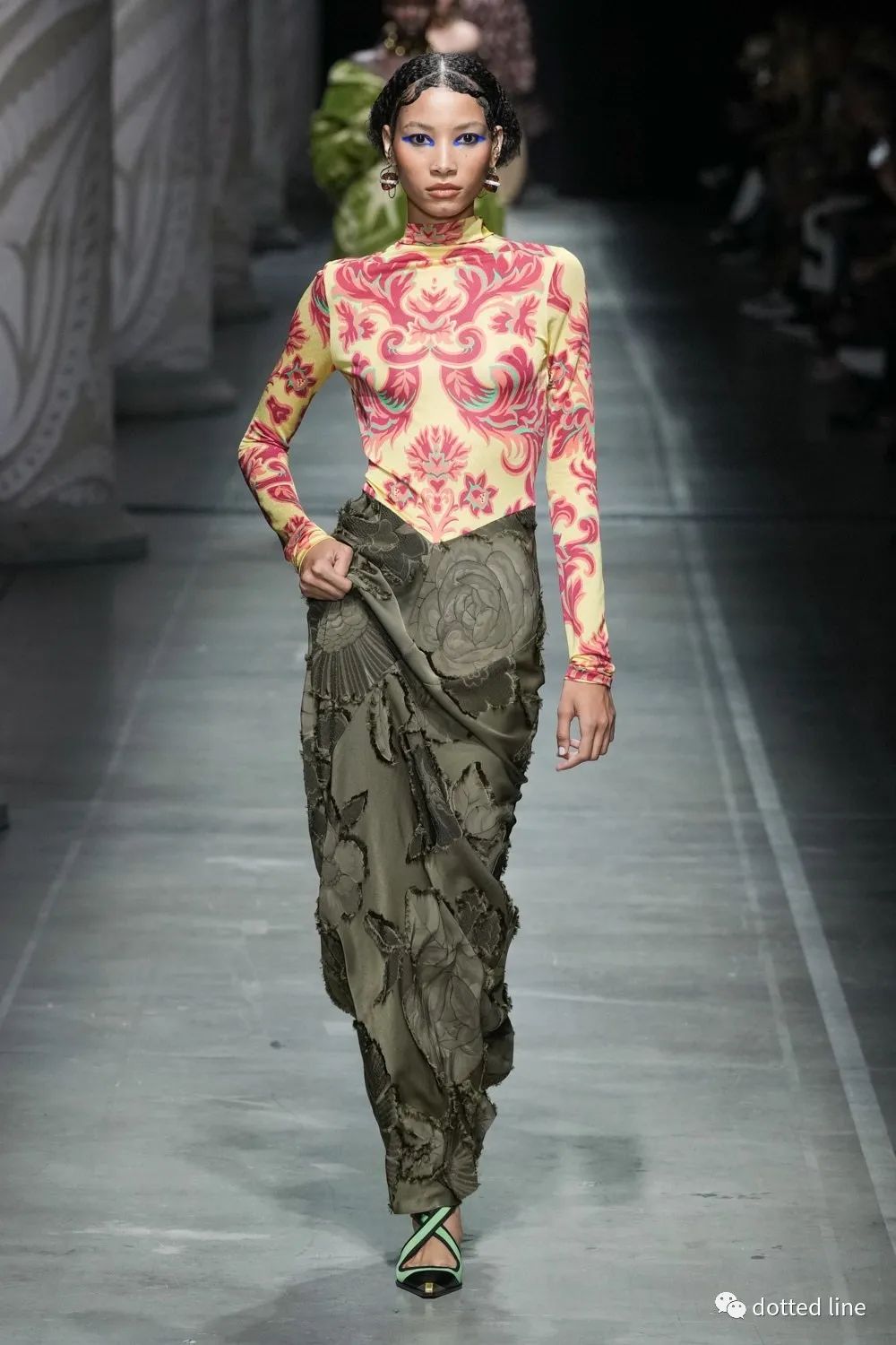 一切都充滿了輕盈感,帶著某種松弛與豁然開(kāi)朗。在廓形中將圖案無(wú)序自由疊加交織,又以極精準(zhǔn)的剪裁塑造線條筆直強(qiáng)烈的縱向感,在服裝底部展開(kāi),打造延伸感和貼合感,為了進(jìn)一步營(yíng)造幻境,設(shè)計(jì)中還融入了古老的邁錫尼圖騰,象征著好運(yùn)。
