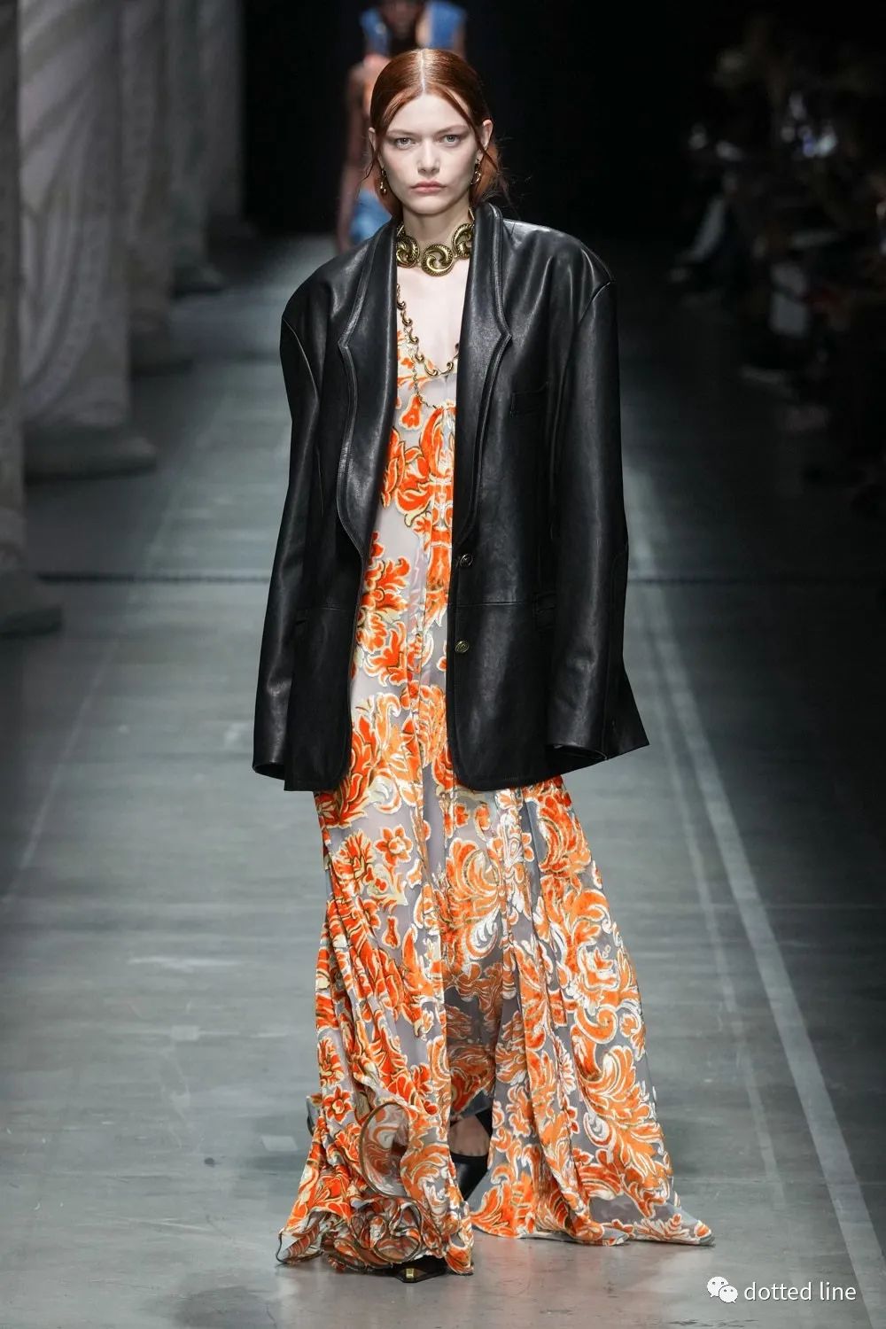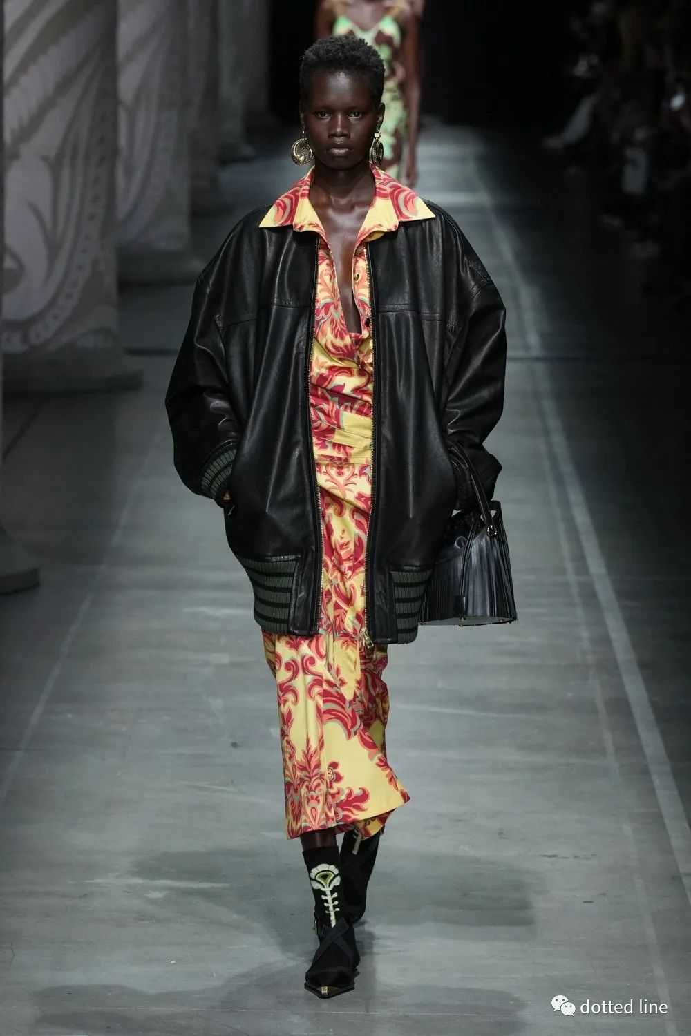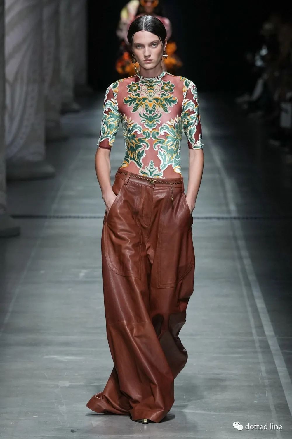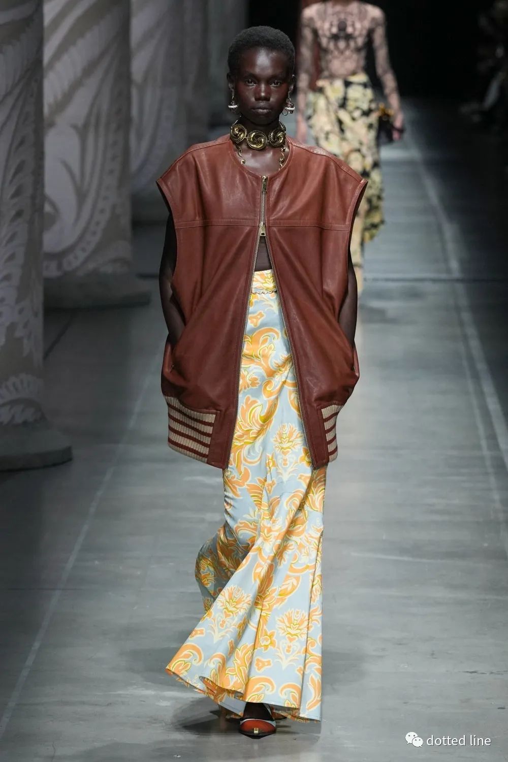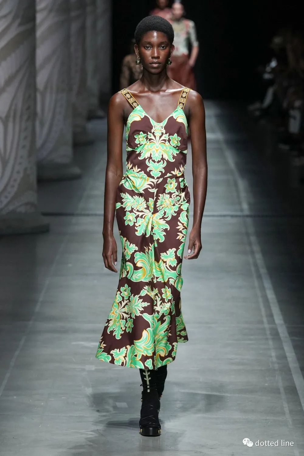 一切都充滿了輕盈感,帶著某種松弛與豁然開(kāi)朗。在廓形中將圖案無(wú)序自由疊加交織,又以極精準(zhǔn)的剪裁塑造線條筆直強(qiáng)烈的縱向感,在服裝底部展開(kāi),打造延伸感和貼合感,為了進(jìn)一步營(yíng)造幻境,設(shè)計(jì)中還融入了古老的邁錫尼圖騰,象征著好運(yùn)。