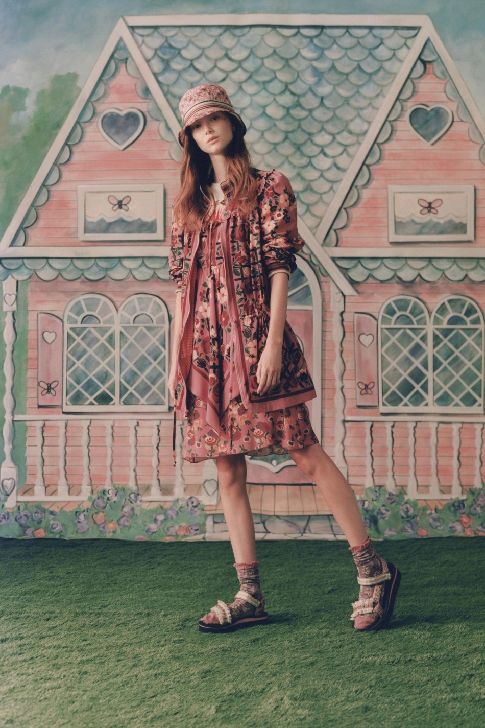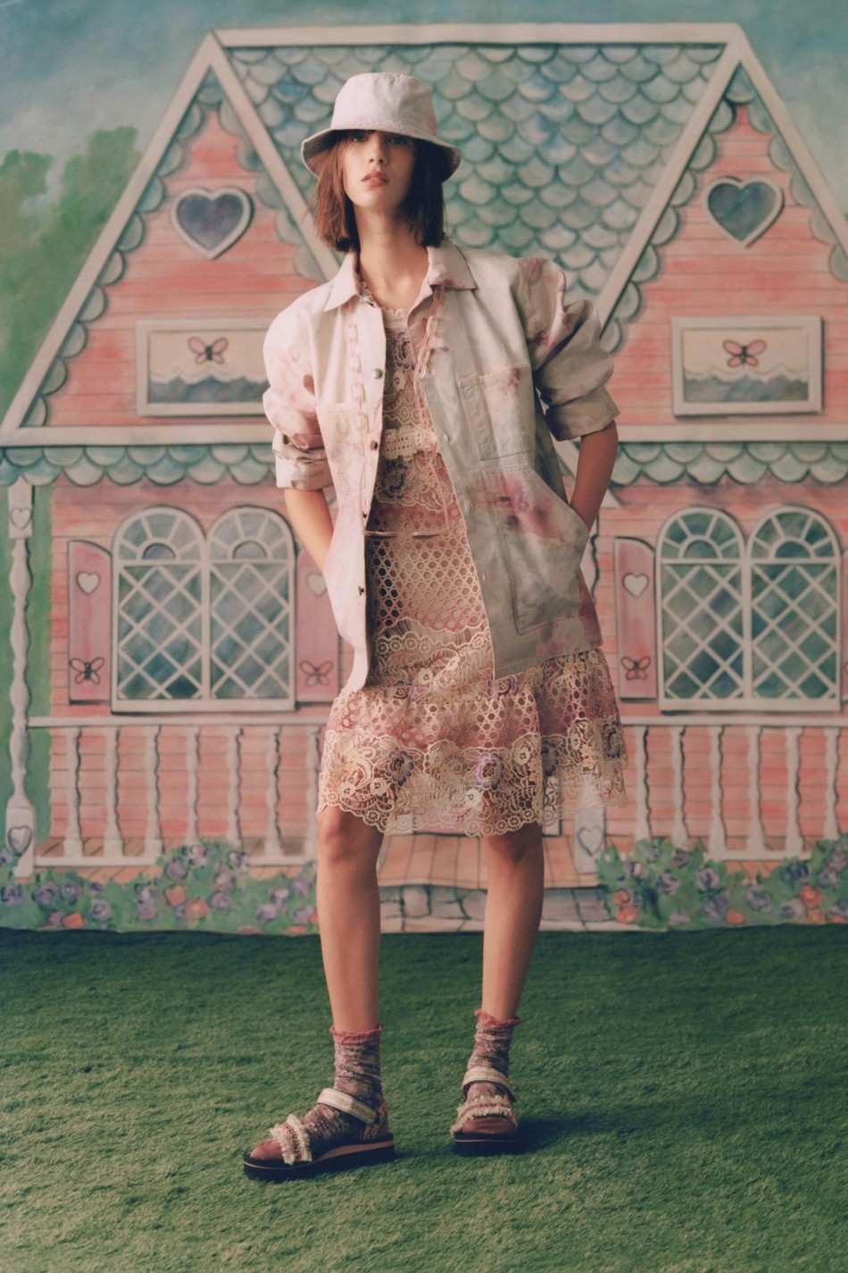 設(shè)計師將該系列命名為“Heartland”,粉紅色小屋、心形窗戶和招牌蝴蝶構(gòu)成的背景夢幻又奇妙。無處不在的刺繡元素標志著設(shè)計者對工藝水平的獨特追求。蒙上灰度濾鏡的玫瑰色、鏤空設(shè)計的短裙,搭配棉質(zhì)薄紗和縐紗混合而成的繡花,使得每款作品都為模特增添了朦朧夢幻的獨特氣質(zhì)。
