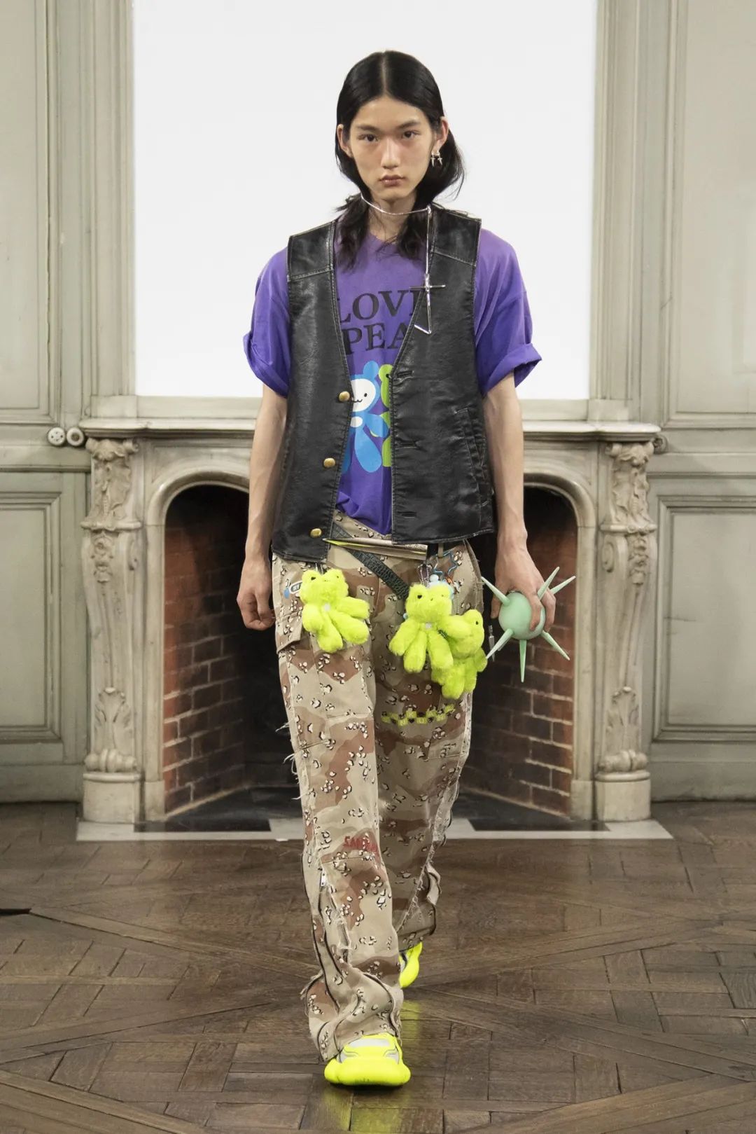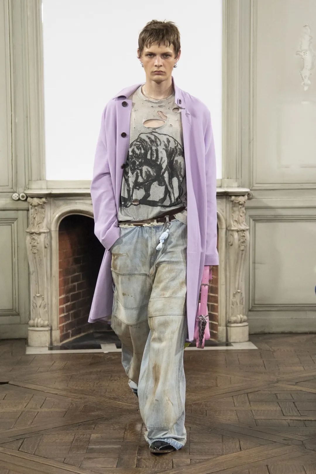 創(chuàng)作者以高級(jí)時(shí)裝上的印花、牛仔水洗等不同的工藝呈現(xiàn),強(qiáng)烈的磨損質(zhì)感傳遞出拒絕臣服于秩序的野性和反叛。保持了 SANKUANZ 以往的幽默性和對(duì)流行文化的熱愛,通過鮮亮可愛的卡通元素,消解掉了本季主題之下史詩般的沉重感,塑造了另一番青年文化面貌。
