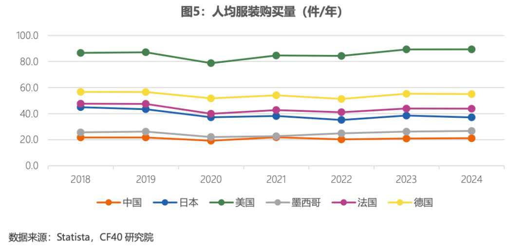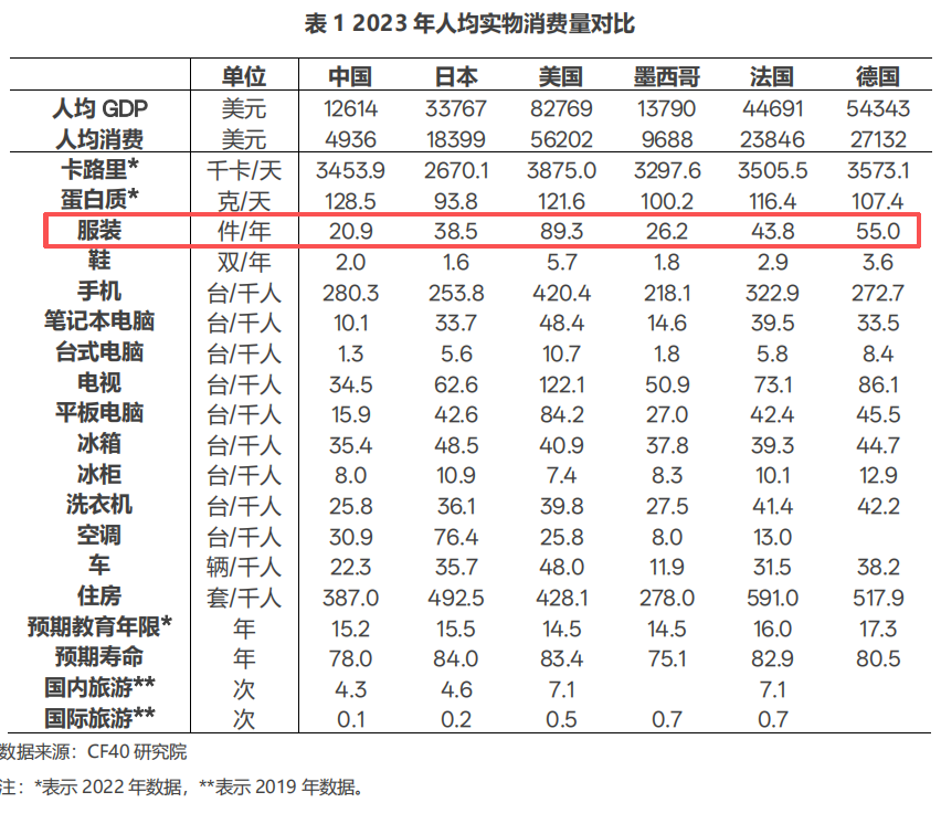 (圖:2018-2024年中國與多國人均服裝消費對比,圖源中國金融四十大論壇)