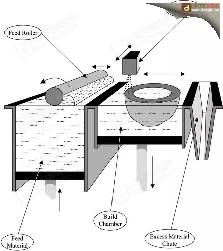 1.3DP的供料方式與SLS一樣,供料時將粉末通過水平壓輥平輔于打印平臺 之上;