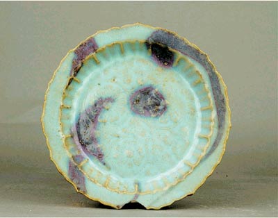 殊不知宋代鈞窯還有另外一種裝飾手法——印花。在許昌博物館的歷史文物陳列中就有一件印花的宋代鈞窯瓷盤(上圖)。這件出土于河南禹州的宋代鈞窯瓷盤直徑20厘米,底部留有3顆支釘痕,是采用通體施釉支燒法燒制而成的。盤內(nèi)除大片的茄皮紫斑外,在盤心還印飾了3朵團(tuán)菊,讓美麗的色彩錦上添花。