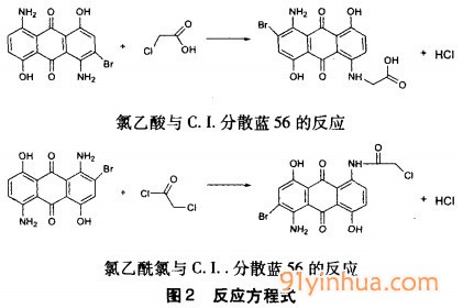 2.1 C.I.分散藍(lán)56改性實(shí)驗(yàn)中選用氯乙酸和氯乙酰氯分別對(duì)c.I.分散藍(lán)56進(jìn)行改性,反應(yīng)方程式為: