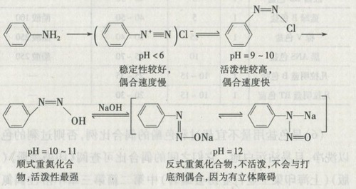 【集萃網(wǎng)觀察】快色素染料是色酚與顯色基的反式重氮化合物的混合物。根據(jù)重氮化合物的特性,它在重氮化以后,因溶液的pH值不同,可以生成各種同分異構(gòu)物,各同分異構(gòu)物的性質(zhì)各不相同。以苯胺為例: