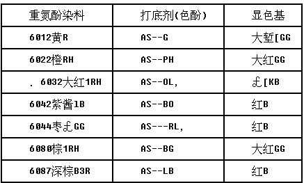 快色素染料就是利用顯色基的反式重氮化合物不會(huì)與打底劑偶合的性能,將它們混在一起,然后又利用反式重氮化合物,在酸的作用下又能轉(zhuǎn)化成能與打底劑偶合的活潑重氮化合物的性質(zhì)而使染料發(fā)色。 顯色基并不是都能做成重氮色酚的染料,一般選用帶有負(fù)性基的顯色基來(lái)制取反式重氮鹽,因它比較穩(wěn)定,且能溶于水。由于帶負(fù)性基的色基僅限于黃、橙、紅及棗紅等色澤,因此色譜范圍不廣。常用的快色素染料見(jiàn)表6—15。
