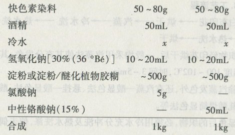 ①染料先用冷水、酒精調(diào)成漿狀,在攪拌下加入氫氧化鈉,使之充分溶解成澄清溶液。 ②把已溶解好的染料溶液濾人糊中,攪拌均勻。 ③在臨用前加入已溶解的氯酸鈉或中性鉻酸鈉溶液。
