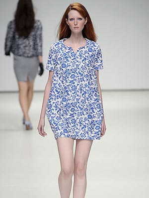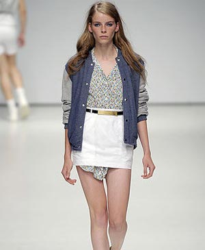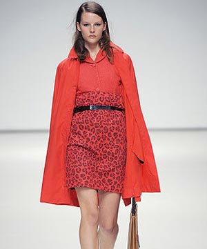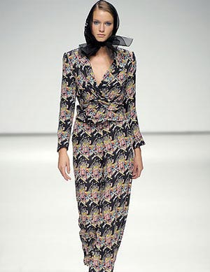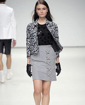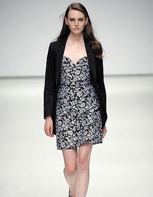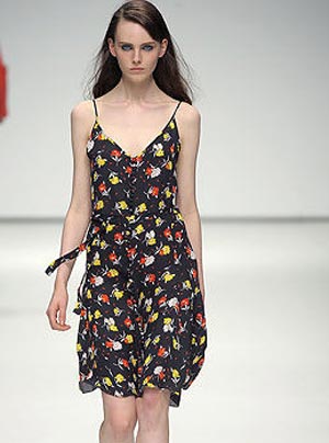 【集萃網觀察】黑白印花:女裝的白襯衫配黑馬甲,灰色運動衫,紅白條紋相間的T恤裙,襯衫裙,高腰的印花裙;男裝中的白西服配黑馬褲,純白的運動衫和運動褲,都在緊跟潮流,而印花似乎成為了這一季許多設計師搶手的寵兒,PeterJensen自然也不例外,色彩鮮明的各式印花點綴在黑色絲綢吊帶裙上,更顯女性嫵媚。