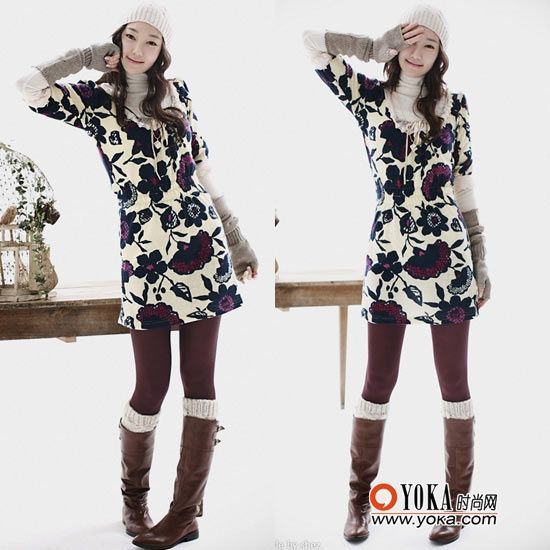 搭配指南:印花款式的針織連衣裙十分喜慶,同樣也能增添幾分甜美感,用彩襪和毛襪來增加層次感,手套和帽子也必不可少。
