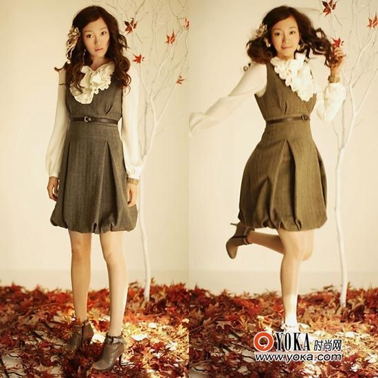 搭配指南:厚重的呢子連衣裙搭配襯衫最完美,選擇領(lǐng)部和袖口比較夸張設(shè)計的襯衫,更加展現(xiàn)復古的一面。