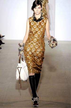 在簡約風(fēng)格下,采用如藏青、土黃、墨綠、艷紅、淡粉等明亮色調(diào),讓09年夏天而那些充滿著復(fù)古主義風(fēng)格的“老式”外套,拼接的錐形高跟鞋,都是設(shè)計(jì)師低調(diào)而不招搖的表達(dá)。