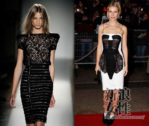 Gwyneth Paltrow在電影《兩個(gè)情人》(Two Lovers)的法國巴黎首映禮上身著的這件黑白相間的Antonio Berardi性感鏤空蕾絲小禮服,大膽將欲遮還羞表達(dá)的淋漓盡致。衣服外層好似被故意剪開,露出內(nèi)層的黑色蕾絲,進(jìn)而內(nèi)衣也隱約可見,黑白搭配若隱若現(xiàn)的皮膚色,層次分明且質(zhì)地強(qiáng)烈對(duì)比。