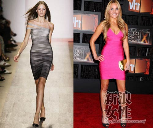 而Amanda Bynes身著的同一系列中的另一件桃紅色的“繃帶裝”將玲瓏的身段暴露在聚光燈下,Herve Leger的服裝也便是暴露的炫耀的雙刃劍。
