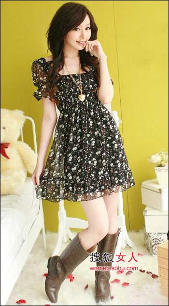 流行解析:寬領(lǐng)的設(shè)計可以展露迷人的性感鎖骨,色彩繽紛的小碎花流行與優(yōu)雅氣質(zhì)并備,搭上一雙款式簡潔大方的長筒靴就萬事OK啦!
