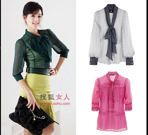 蝴蝶結(jié)的運(yùn)用在本季幾乎到了泛濫的程度,從頭到腳無(wú)處不見(jiàn)“蝴蝶”蹤影。襯衫領(lǐng)域當(dāng)然也不會(huì)寂寞,只不過(guò)蝴蝶大多乖乖待在衣領(lǐng)的位置,始終認(rèn)為,還是那點(diǎn)綴在頸間胸前的柔美一系,最能傳達(dá)出女性的甜美式優(yōu)雅。