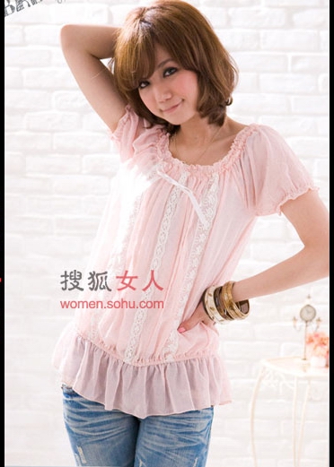 搭配建議:今年春夏季必敗的荷葉滾邊短袖蕾絲罩衫,運用了特別的寬松式剪裁,四周的荷葉滾邊設計,更是增添了飄逸感;領口處的布蕾絲裝飾,增添了優(yōu)雅氣質。