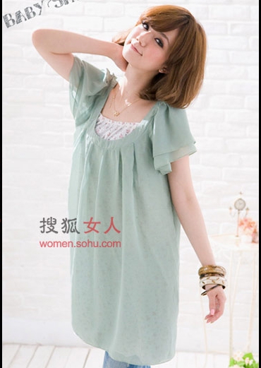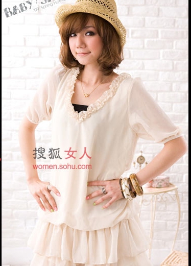 搭配建議:作為2009春夏季的潮流主打款,這款洋裝以雪紡作為材質,展現(xiàn)出女人淑女、柔美的一面;公主袖與荷葉滾邊領口的甜美設計,為甜美度再次加分,無論是單穿或是內搭都非常有型呢!