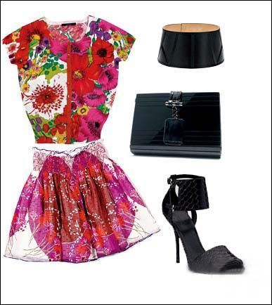 簡單的純色背心搭配圖案繁復(fù)的花朵傘擺裙,將腰部收緊讓裙擺蓬開,塑造優(yōu)雅復(fù)古的淑女輪廓。