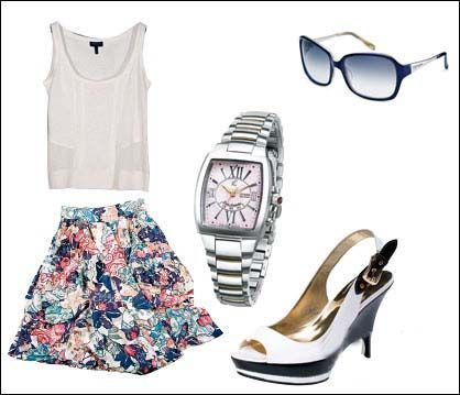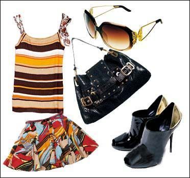 黃白棕條紋T恤搭配一條大地色的花朵超短裙,暗調(diào)的下半身并不會(huì)搶了上半身的風(fēng)頭,有主有次才不至于讓人眼花繚亂。