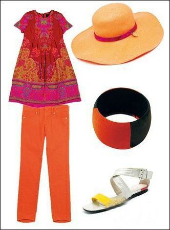 帶有民族特點(diǎn)的印花上衣與同色系長褲搭配,具有濃郁的異域風(fēng)情,寬檐遮陽帽和編織手袋強(qiáng)調(diào)這一身的度假感。