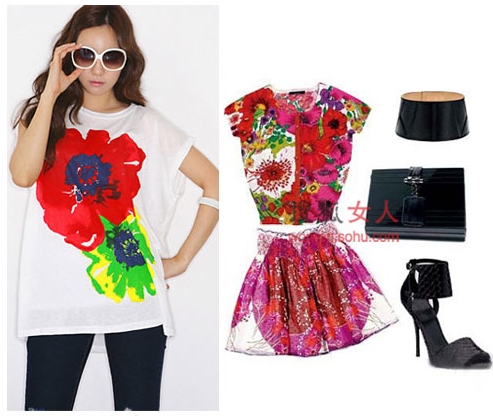 時尚解析:上下身同樣以黑色為底色,同樣都有紅色花朵相呼應,這樣再復雜的圖案都可以和諧地搭配在一起,帶來很強的視覺沖擊。