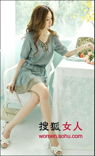 穿衣點評:粉色印花分節(jié)式連衣裙,荷葉邊裙擺設(shè)計顯得很柔情,配上模特白皙的皮膚和卷發(fā),散發(fā)女人的柔媚。