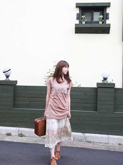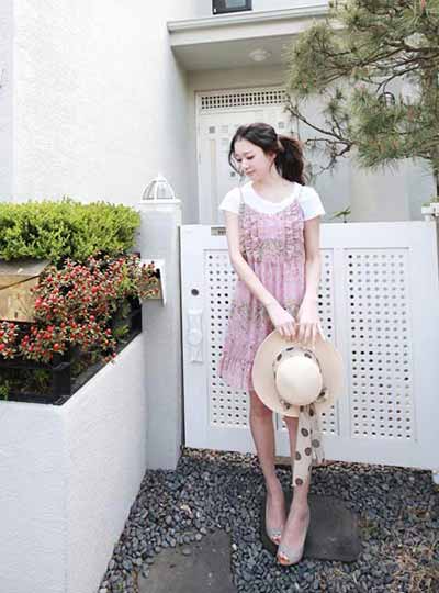 田園風(fēng)的碎花吊帶短裙,內(nèi)搭粉色T恤,一頂清爽的白色草帽增加甜美度