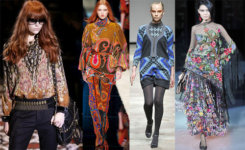 70年代的“花的孩子”從夏天一直延續(xù)到秋冬。用長裙、喇叭褲等勾勒出修長的身體輪廓,而因?yàn)榧竟?jié)原因,印花的色澤變得更加濃重,除了花朵圖案,還有取自俄羅斯、羅馬尼亞等頗具異國情調(diào)的民族圖案。常見暖色調(diào)的番茄紅,有時(shí)點(diǎn)綴著明亮的孔雀藍(lán)和黃色。當(dāng)然,“嬉皮士”還離不開流蘇。流蘇絲巾、長纖維的皮草披肩,從腰部和肩部傾瀉下來。