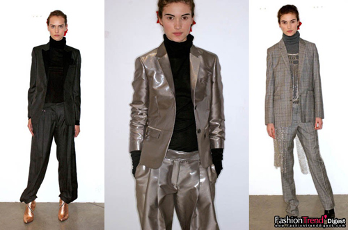 09秋冬,時(shí)尚重歸單純,建筑感成為輪廓的關(guān)鍵詞,這一切把套裝又帶回我們眼前。對(duì)單純或者建筑感的追求使設(shè)計(jì)師回歸了經(jīng)典的西裝剪裁技術(shù);單純的心境也摒棄了長(zhǎng)久以來(lái)Bling Bling的風(fēng)格,轉(zhuǎn)而以低調(diào)的態(tài)度追逐產(chǎn)品本身的內(nèi)涵。于是剪裁考究、肩部造型強(qiáng)壯,具有80年代感的長(zhǎng)褲套裝是最具趨勢(shì)性的回歸。如果說(shuō)需要一些變化的話就是關(guān)于銳角肩部造型的上裝與流動(dòng)的寬腿褲和香煙褲或緊身褲的變化。當(dāng)然套裝考究的剪裁沒(méi)錯(cuò),但對(duì)于女人來(lái)說(shuō),打造一個(gè)"看起來(lái)毫不費(fèi)力的造型"(Effortless Style)更重要。這方面的大師級(jí)典范可以參照Kris Van Assche,Dior Homme的設(shè)計(jì)總監(jiān)可不是玩的,人家就能把好好的套裝硬給弄擰巴了,寬腿褲偏要穿得皺皺巴巴,配上雙極富女性味的短靴,楞是在80年代的都市感中混入了一些街頭的不羈感或搖滾元素,那叫一個(gè)"型"。
