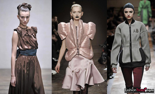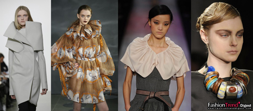 這是一個(gè)"大"即美的季節(jié)。無(wú)論是象山似的輪廓,披肩般的領(lǐng)子,或鐐銬樣的手鐲。在諸多元素中,領(lǐng)子成為設(shè)計(jì)師最好把玩的部分,因?yàn)檫@很容易成為新的視覺(jué)重點(diǎn)。煙囪領(lǐng)或者撐開(kāi)的雕塑效果都是具有趨勢(shì)的,而最好玩的當(dāng)數(shù)褶飾領(lǐng),來(lái)自法國(guó)啞劇中的小丑著裝靈感,圓圓的褶皺如立體花朵一般矗立著,把個(gè)臉蛋襯托得象只碩大的花芯。層疊或超大的效果如披肩一般,一種具有幽默意味的新浪漫主義風(fēng)格由此產(chǎn)生。項(xiàng)鏈也不再是傳統(tǒng)意義上的項(xiàng)鏈,一切以項(xiàng)圈或像"Cuffs"的形式出現(xiàn)。無(wú)論是石頭的、金屬或者塑料的,碩大與重量感成為其衡量標(biāo)準(zhǔn)?傊子靡痪潆娪芭_(tái)詞,這個(gè)季節(jié),"只買(mǎi)大的,不選對(duì)的。"