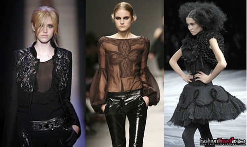 黑色依然是09秋冬的絕對(duì)主角,一個(gè)革新的趨勢(shì)是采用微妙差別的黑與黑的組合。也就是說(shuō),如烏鴉一般的一身黑漆漆沒(méi)錯(cuò),但需要有一些肌理與光澤的變化,比如絲與閃光的亮片,法蘭絨和色丁,天鵝絨與閃光提花的對(duì)比效果。但無(wú)論怎樣,黑色還是黑色。潮流的推薦是:運(yùn)用高而窄的造型,黑與黑的多層疊置;比如學(xué)一下Givenchy,以輕量的紗或蕾絲創(chuàng)造表面的差異化對(duì)比,再配上wet look濕漉漉的黑色緊身褲,兼具本季最in的黑色歌特浪漫風(fēng)格和搖滾精神。