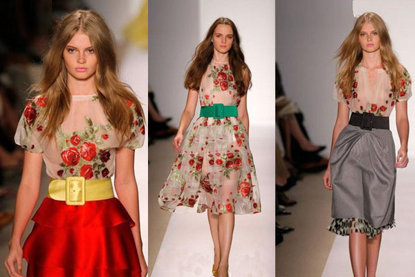 T臺(tái)上:碎花雪紡的搭配,以清新為主,與漆皮腰帶的搭配,OL風(fēng)格的春裝,展現(xiàn)的是飄逸的美感。