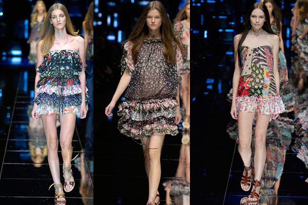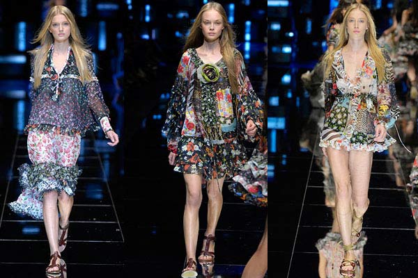 T臺(tái)上:D&G絕對(duì)是將碎花雪紡做到了極致,整個(gè)SHOW場(chǎng)仿佛一個(gè)花花的世界,輕薄但也不失分量感的設(shè)計(jì)如今被各種時(shí)尚品牌借鑒發(fā)揮。想找到這樣的單品非常容易。