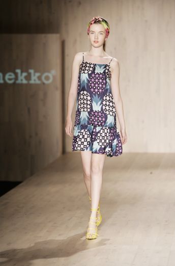 本季的作品之多,其中包括了放肆性感的流動(dòng)感夏季裙、有光澤的針織服、動(dòng)動(dòng)夾克以及簡(jiǎn)潔而少修飾的 裙子、褲子和外套。色彩運(yùn)用的也比較寬,有夏季的色調(diào),如粉紅、黃色和凈藍(lán),和秋季的深灰色和楊李色,偶有黑顏色的點(diǎn)綴。大部分風(fēng)格內(nèi)蘊(yùn)涵了具有Marimekko特色的印花,大小錯(cuò)落有致,清爽的單色調(diào)夾雜于其中。運(yùn)動(dòng)的風(fēng)格張顯了青春的魅力。