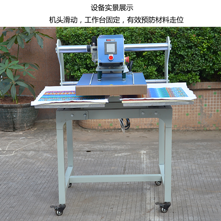 氣動(dòng)雙工位燙畫機(jī)可將升華類、溶劑類油墨的彩色圖案與文字經(jīng)熱轉(zhuǎn)印在棉、麻、化纖、尼龍等織物及陶瓷制品上,還可進(jìn)行植毛燙畫和發(fā)泡印花工藝等的熱處理,及服裝的低溫低壓襯與面料的粘合,如服裝、鞋帽等粘合之用,也可用于生產(chǎn)小批量的手帕