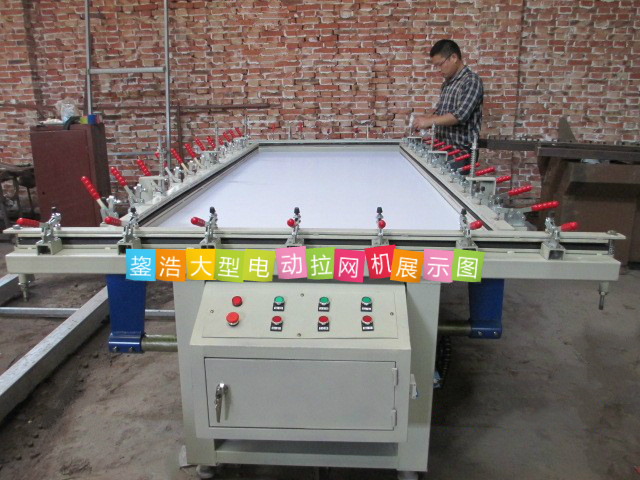 大型電動繃網(wǎng)機(jī)是制作專業(yè)大型網(wǎng)版的必備機(jī)械,具有經(jīng)久耐用,省時省力等特點。適合絲網(wǎng)印刷的各個行業(yè),如玻璃廠,服裝廠,制版廠和廣告的大網(wǎng)版和批量網(wǎng)版的制作,操作簡單,制版張力高,一經(jīng)推出好評不斷。此大圖規(guī)格1800*3000mm,也可根據(jù)客戶的需求加工定制,歡迎各界朋友咨詢洽談。。