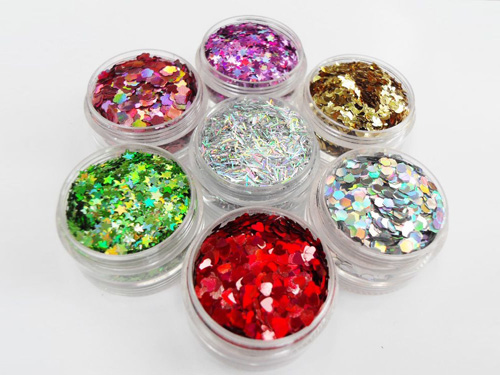 金蔥粉(glitter),也叫金銀片,亦或閃光片,由精亮度極高的不同厚度的電鍍膜材料經(jīng)精密切割而成。其材質(zhì)有 PET、PVC、OPP、金屬鋁質(zhì)、激光鐳射材料,金蔥粉粒徑可從0.004mm-3.0mm均可生產(chǎn)。其形狀有四角形、六角形、長方形等。金蔥粉色彩有金色、銀色、七彩色、彩色、幻彩色、珠光色、鐳射等供于選擇。各色系均加上表層保護層,色澤光亮,對氣候,溫度的輕度腐蝕性化學(xué)品具有一定抵抗力及耐溫性。