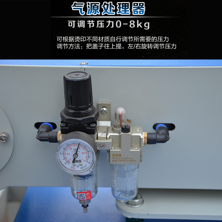 1、連接所配壓縮機(jī)接頭,打開氣壓,將壓力表調(diào)制(4pB-6pB),使發(fā)熱板升起;