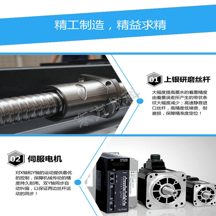 高精度雙絲桿----用進(jìn)口高精度研磨滾珠絲桿替代廣大廠家使用的同步帶,運行聲音小,精度高,耐磨損;直線導(dǎo)軌采用臺灣進(jìn)口HIWIN上銀品牌,品質(zhì)有保證。